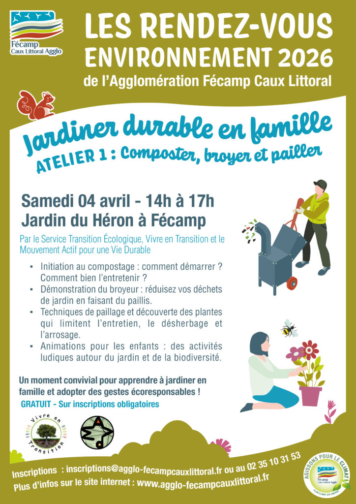 - Samedi 4 avril, 14h à 17h au Jardin du Héron à Fécamp : atelier « Composter, broyer et pailler »